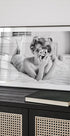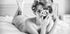 A stylish black and white poster that captures a retro-inspired portrait of a woman with vintage hair coils, lying elegantly on a bed while holding a classic camera. With a mixture of sensuality, nostalgia and artistic expression, the photography celebrates female attraction and timeless glamour.