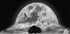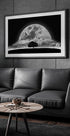This surreal black and white artwork shows a lone tree under a glowing full moon, with birds soaring above a dreamy night sky. Clouds drift through the luminous scene, uniting fantasy and nature in a striking composition that captures mystery, wonder and timeless elegance.