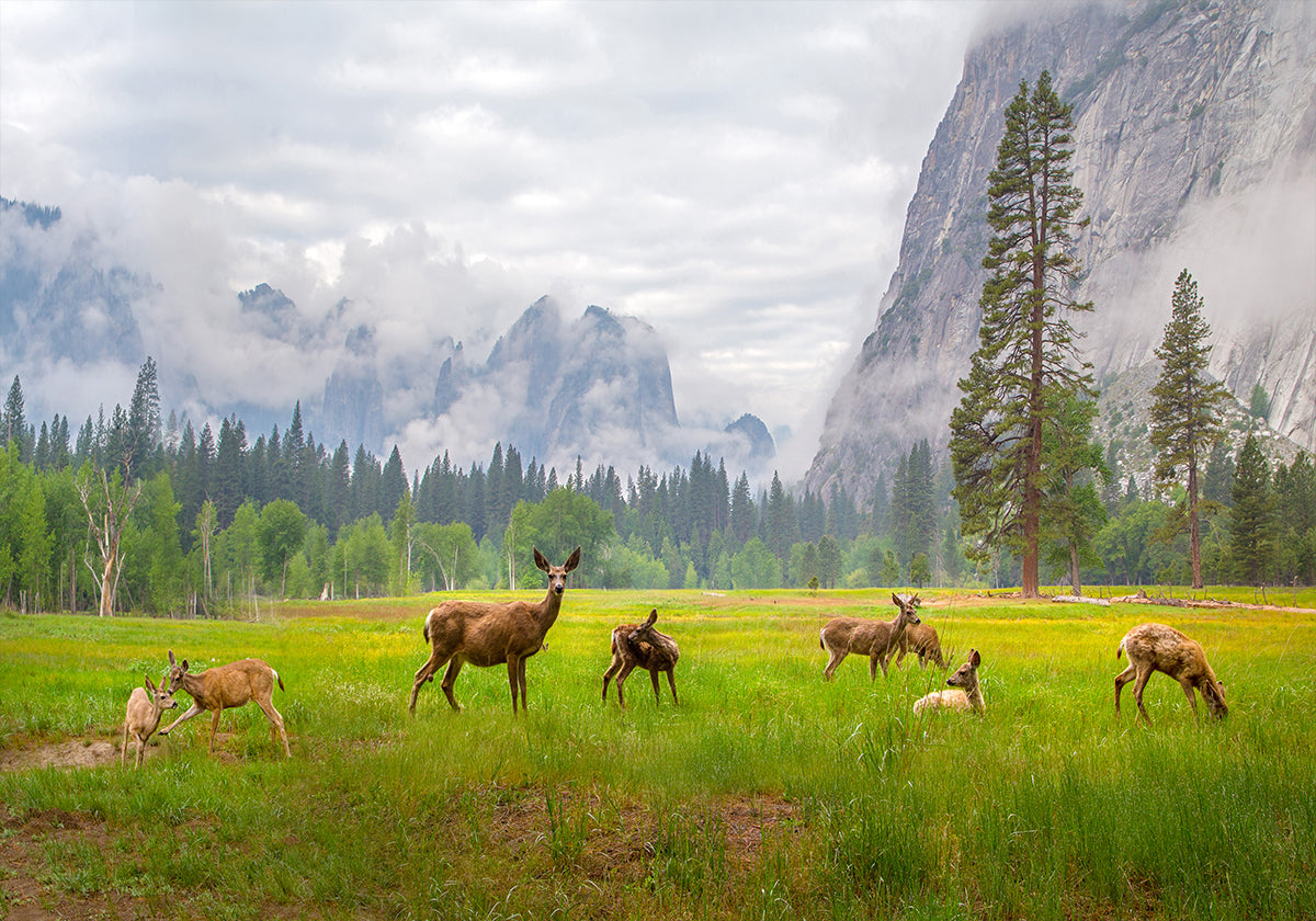 A quiet herd of deer rests in a sunlit meadow, framed by dark pines and the monumental granite walls of Yosemite Valley. Dianne Mao's photography captures the meeting between light and shadow and evokes calm, depth and the poetry of nature – a timeless motif that brings the soul of the wilderness into the home. Perfect for living room, bedroom or cabin inspiration.