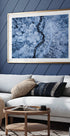 An icy blue river cuts through a snow-covered landscape seen from the air, where frost tracks draw clear lines between dark trees and white expanses. The cool palette and the calm rhythm of the curves capture the quiet intensity of winter. Photo art by Daniel Gastager, which balances raw nature and poetic calm. Creates depth and calm in the room.