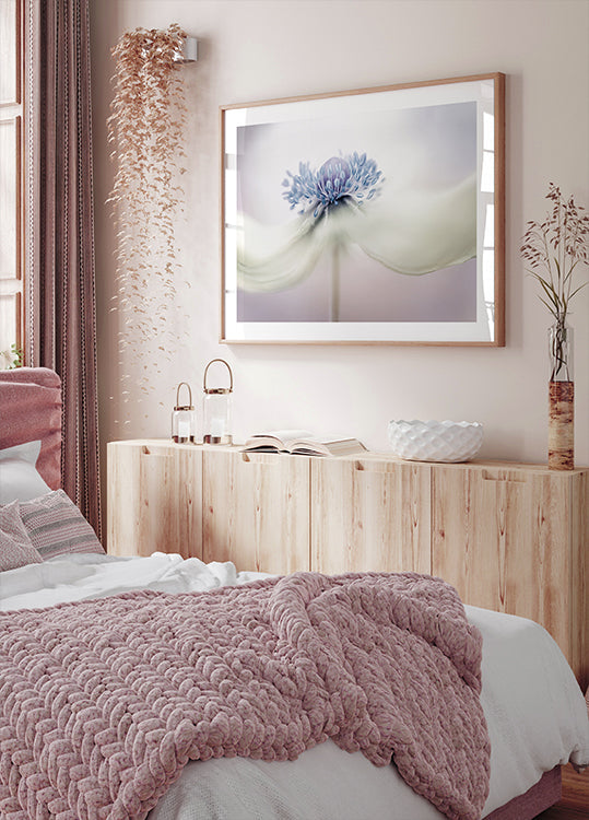 This dreamy macro photograph captures the fragile elegance of a Japanese anemone in soft shades of white and lavender. With its ethereal petals and detailed stamens, the artwork exudes calm and purity, creating a refined botanical work that combines stillness with timeless floral beauty.