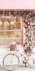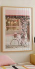 Capture the romantic mood of spring with this dreamy poster depicting a pastel pink bicycle resting in front of a flower-adorned cafe. Filled with delicate pink roses and flowers, the facade radiates joy, sweetness and fairytale charm. The soft tones and feminine aesthetic make this work ideal for gallery walls that celebrate love, beauty and quiet moments of joy. Perfect for cozy homes, cafes or anyone who loves vintage bikes and soft flowers.