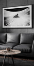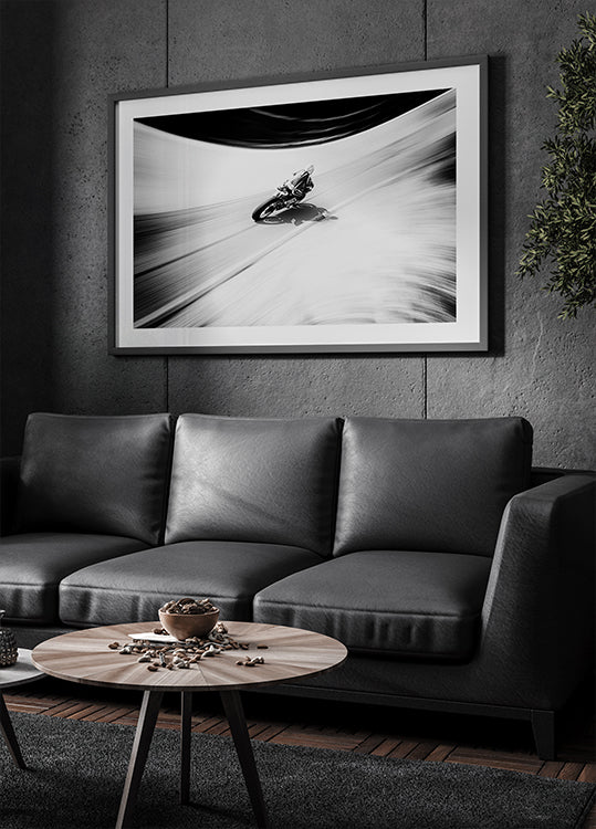 This energetic black and white artwork captures a motorcycle at full speed, with dramatic motion blur that emphasizes speed and power. The sharp contrast between the driver and the curved curves creates an intense feeling of adrenaline, a distinctive work for lovers of speed, motorsport and bold design.