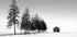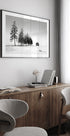 A Sunny Winter Day by Steven Zhou depicts a bright, black and white winter landscape. The sun glistens in the snow and hoarfrost as geese move past a lonely barn and farmhouse. The bare trees and the clear air create a calm, pastoral atmosphere with timeless elegance and Nordic coldness. A high-contrast look gives the motif a modern, graphic calm.