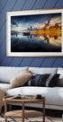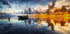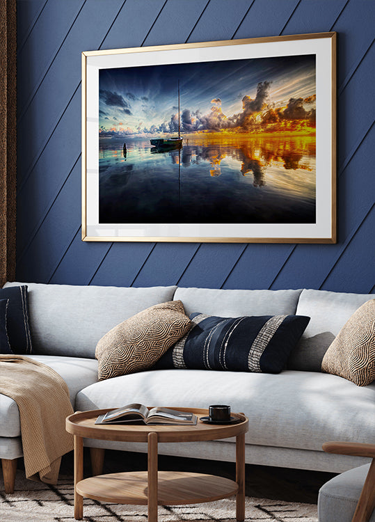 This breathtaking seascape captures a lone sailboat resting on calm water under a dramatic sunset sky. The reflections of golden clouds ripple across the surface of the water, combining tranquility with grandeur, creating a timeless piece of maritime art that exudes peace, tranquility and natural beauty.
