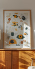 A playful and surreal abstract poster with striking eye motifs in warm shades of orange, ocher and green. With its mid-century modern look and geometric pattern, the artwork combines both playfulness and elegance—a perfect choice for retro-inspired interiors, eclectic gallery walls, or bohemian home decor.
