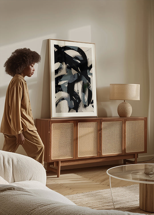 A striking abstract poster with strong black brush strokes layered with soft beige and muted gray shades. The sweeping strokes create depth and rhythm, and give a dynamic yet minimalist expression—perfect for Scandinavian interiors, modern decoration or contemporary gallery walls.