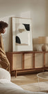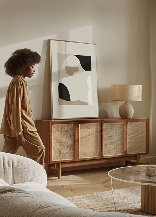 A modern abstract poster with layered geometric shapes in soft beige, black and white shades. The minimalist composition creates balance and contrast, and combines Scandinavian tranquility with modern design. Perfect for adding sophistication and harmony to modern interiors.
