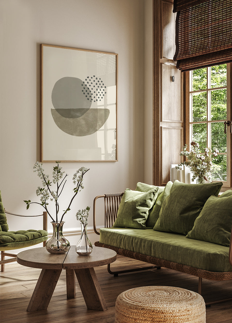 The poster shows a minimalist composition with organic shapes in muted colors. A large gray circle overlaps a beige semicircle, while a collection of small, dark dots float above them. The background is light beige, which gives a calm and harmonious impression. The simple design fits well in modern interiors.