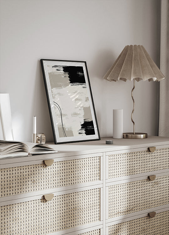 A modern abstract painting with bold brush strokes in black, white and beige. The textured composition brings a sense of balance and artistic expression to any interior. Perfect for minimalists and art lovers.