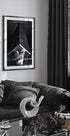 This poster captures the A'DAM Tower in Amsterdam in a dramatic black and white perspective, where the facade's windows, glare and deep shadows form a graphic rhythm. The sharp lines and reflections lead the eye upwards and give a strong, urban atmosphere. Photograph by Roland Weber. A tribute to modernist architecture and the city's pulsating energy at the IJ.