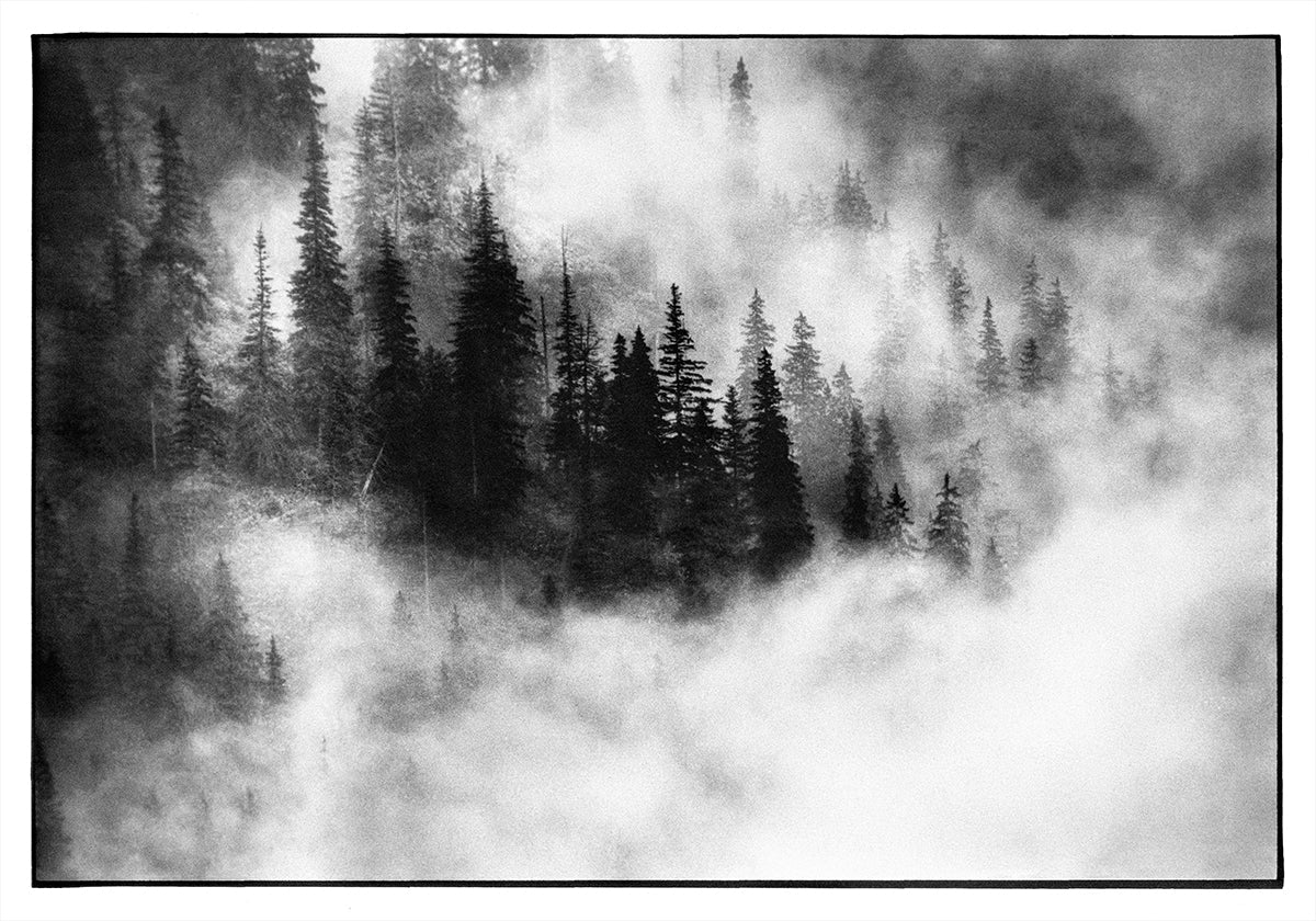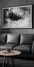 A dramatic black-and-white poster of a mist-shrouded forest, with tall fir trees emerging through the mist. Recorded in Poland, it creates an atmosphere of mystery and tranquility - ideal for minimalist and modern homes.