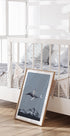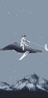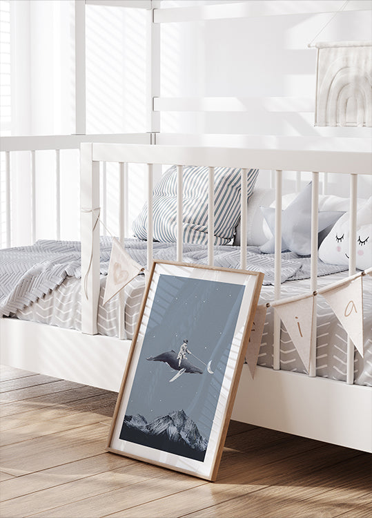 A surreal and imaginative artwork depicting a boy riding a whale through a starry night sky while controlling the crescent moon with a stick. Above snow-capped mountains, this dreamy composition captures childhood wonder, imagination and limitless imagination – perfect for children's rooms and playful interiors.