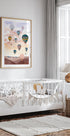 A dreamy poster with colorful hot air balloons floating over a pastel sky and mountain peaks. The artwork expresses a sense of adventure, freedom and joy - ideal for children's rooms, travel lovers or as uplifting wall art.