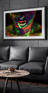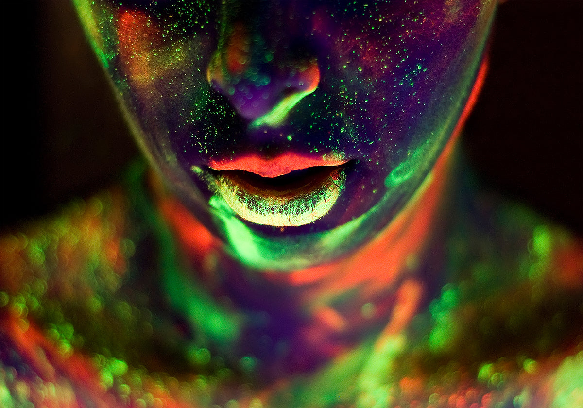 A striking portrait that glows under UV light, where neon colors transform the face into a cosmic canvas. Vibrant greens, fiery reds and brilliant yellows illuminate the skin and create a surreal blend of mystery and intensity. This bold work of art celebrates colour, light and human strength.