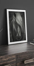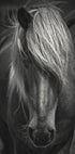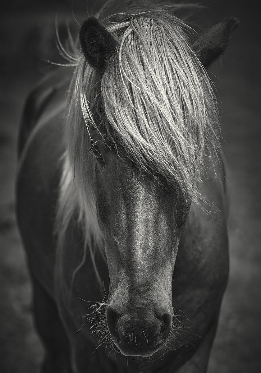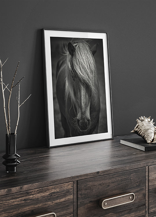 A striking black and white portrait of an Icelandic horse, with the mane falling forward in a stylish, windswept look. The monochrome tones emphasize the raw texture of the hair and the calm strength of the animal, creating a bold yet intimate animal portrait. Perfect for nature lovers and minimalist interiors.