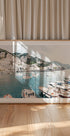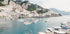 A breathtaking photograph of the Amalfi Coast, where pastel colored houses rise above the cliffs and boats float peacefully in the turquoise waters. The scene captures the essence of Italian summer – a harmonious blend of coastal charm, architecture and the tranquility of the Mediterranean.