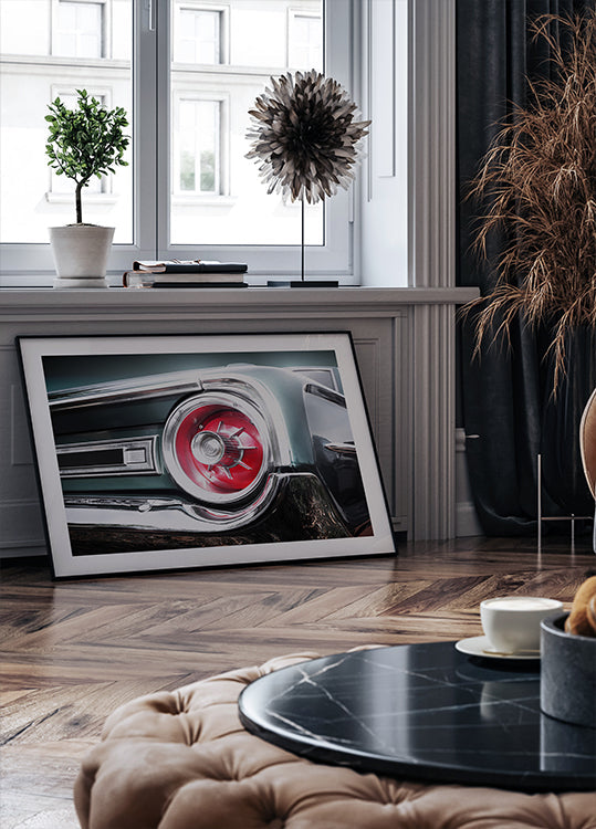 A detailed close-up of the tail light on the legendary 1964 Ford Galaxie 500, an icon of American automotive design. The artwork highlights the chrome detailing, the elegant lines and the distinctive red tail light that defined 1960s road cruisers. A perfect nostalgic piece for lovers of classic American cars.