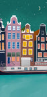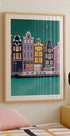 An evocative illustration of Amsterdam at night, where iconic canal houses are reflected in the dark blue water and small boats glide quietly by under a deep navy blue sky. Warm light in the windows and teal tones create calm metropolitan poetry. Created by artist Petra Lizde. A modern cityscape that captures the rhythm of canals and bridges in the glow of the night.
