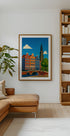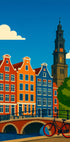Dream yourself to Amsterdam with this colour-saturated illustration of a bicycle by a quiet canal, surrounded by trees and iconic gabled houses. Streaks of the sun are reflected in the water as retro travel style meets modern minimalism. An evocative work by Taudalpoi, perfect for city lovers. A tribute to wanderlust, nostalgia and Nordic color poetry.