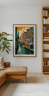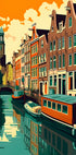 Taudalpois Amsterdam Canal Houses captures the charm of the city's narrow gabled houses along the canal. Warm orange tones are reflected in the water, while boats and bicycles suggest calm movement through the historic streets. A nostalgic travel poster with graphic clarity and modern vintage feel. Perfect for lovers of Amsterdam and Nordic urban poetry.
