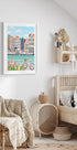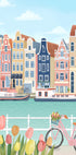 A colorful and charming illustration of Amsterdam city with its iconic canal houses, bicycles, tulips and boats. The artwork captures the essence of Dutch culture, with vibrant facades, quiet canals and a romantic urban atmosphere. Perfect for travelers and those inspired by European charm.
