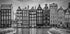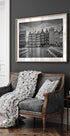 An iconic black-and-white depiction of Amsterdam's Damrak: the famous dancing houses stand in graphic rhythm along the canal, with reflections in the calm water and dramatic clouds above the city. Melanie Viola captures the historic facade and urban pulse in a timeless motif, perfect for modern, Nordic interior design in the home.