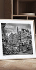 A timeless black-and-white look over Amsterdam's Bloemgracht: a classic bridge with parked bicycles is reflected in the quiet canal, while narrow gabled houses and sky banks draw a poetic, urban silhouette. A calm, graphic composition by artist Melanie Viola that captures the city's iconic rhythm. Perfect for those who love the Nordic big city atmosphere.