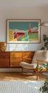 "Amsterdam Jordaan Westerkerk" by Remko Heemskerk captures the charm of the Jordaan neighborhood: colorful row houses, sharp facades and the iconic Westerkerk rising above the city's rooftops. A graphic, playful composition in bright colors that distills Amsterdam into pure metropolitan poetry. Perfect as an eye-catcher in the home.