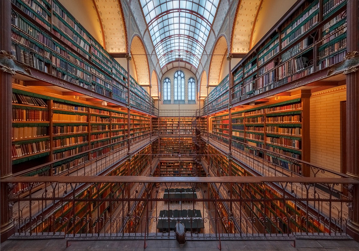 A breathtaking look into Amsterdam's iconic library space: towering bookshelves, elegant cast-iron galleries and a winding staircase bathed in soft, golden light. Daniel Viñe captures the calm and grandeur of the city's cultural heritage and invites you to explore between the shelves. A touch of timeless symmetry and quiet contemplation.
