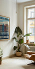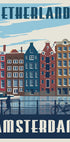 Capture the atmosphere of Amsterdam with a stylish travel poster: colorful canal houses with classic gables are reflected in the water, a bicycle rests on the railing of the bridge and small boats glide by under a soft evening sky. Graphic, minimalist and iconic – an eye-catcher that brings the charm of the big city home. The title AMSTERDAM is clearly visible as graphic text.