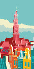 Remko Heemskerk pays tribute to Amsterdam with a stylish illustration of the Westerkerk in the heart of the Jordaan. The iconic bell tower rises above canals and narrow gabled houses, bathed in clear skies and graphic surfaces of color. A modern urban silhouette with a classic soul – perfect for lovers of architecture and city life. Here.