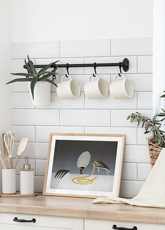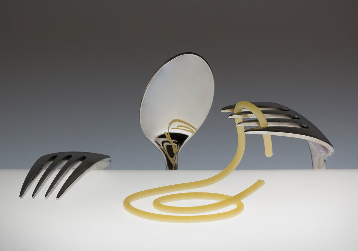 A playful still life where forks, a spoon and a spaghetti thread create a humorous composition. The cutlery is arranged as figures, while the pasta acts as flowing hair. This witty work of art mixes food and fantasy, transforming an everyday meal into a surreal, artistic portrait.