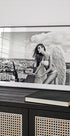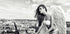 A dramatic black and white artwork of a woman with angel wings looking out over a vast city skyline. Blending fantasy and urban realism, this striking image evokes strength, beauty and mystery – an angelic presence against the modern metropolis skyline.