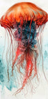 A stunning watercolor illustration of a jellyfish, with fiery orange bell and long strands floating gracefully in shades of blue. This marine artwork captures the elegance of underwater life with painterly detail, uniting art and nature in a breathtaking aquatic scene.