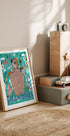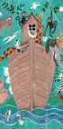 A playful and colorful illustration of Noah's ark filled with animals such as giraffes, elephants, zebras, monkeys and birds. Surrounded by lush flowers and lively water, this charming work of art captures the joy and imagination of the beloved Bible story. Perfect for children's rooms, nurseries or for anyone who loves animal illustrations.