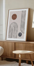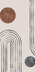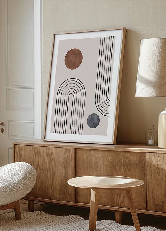 An elegant abstract poster with strong geometric shapes, circles and curved black lines on a beige background. Inspired by mid-century modern design, this minimalist artwork combines balance, rhythm and elegance, making it a versatile piece for modern interiors.