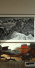 A stunning black and white photograph of a mountaineer standing on a narrow snow ridge in the French Alps. The dramatic view captures jagged peaks, deep valleys and glaciers stretching to the horizon. A strong tribute to adventure, endurance and the beauty of the alpine landscapes.