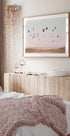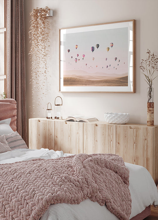 A dreamy photograph of colorful hot air balloons floating above golden sand dunes under a pastel sky. The artwork captures the magic of travel, freedom and adventure, making it a beautiful piece for any decor inspired by wanderlust.
