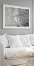 A breathtaking poster of a white peacock with its feathers fully spread out, exuding purity and grace. The striking composition captures the bird's majestic beauty in quiet detail, evoking a sense of fantasy and angelic elegance. An eye-catcher that combines the wonders of nature with artistic sophistication.