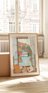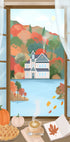A cozy autumn scene seen from a window, with a charming lakeside cabin surrounded by colorful autumn leaves. The illustration's warm seasonal details with pumpkin, pie, coffee and candles make it perfect for farmhouse style, rustic and cozy-inspired interiors.