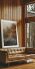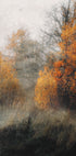 A picturesque autumn forest disappearing into soft mist, with glowing orange and amber leaves layered against muted grey-green streaks. The textured style gives a dreamy and atmospheric expression that captures the quiet transition of autumn. A calm nature poster for a warm gallery wall.