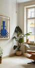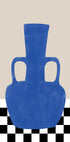 A bold modern piece of art with a deep blue vase against a minimalist beige background and a striking black and white checkered floor. Combining abstraction with interior design aesthetics, this geometric and contemporary still life creates a stylish visual focal point.