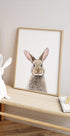 A lovely portrait of a baby rabbit captured against a pure white background. The soft fur, erect ears and innocent look make this piece perfect for children's rooms, nurseries or for anyone who loves cute animal portraits.