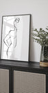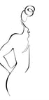 A minimalist line drawing of a woman seen from behind, done with flowing black lines on a light white background. This abstract figurative artwork emphasizes simplicity, elegance and form, and is ideal for modern and minimalist interiors.