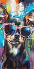 A vibrant street art pop art portrait of a Chihuahua wearing colorful sunglasses, painted with bold graffiti inspired strokes. This playful and modern piece of art combines humour, style and urban energy to add a fun and edgy vibe to any space.