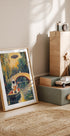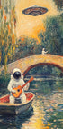 A surreal impressionist style painting of astronauts in an earthy landscape. An astronaut sits in a boat and plays the guitar while another gestures from a stone bridge under a golden sky. Above them hovers a UFO that combines science fiction with art history in a humorous and imaginative scene.
