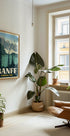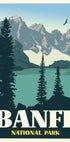 A timeless travel motif from Banff National Park: turquoise, mirror-like mountain waters framed by dark green pines, with snow-capped peaks rising on the horizon. Clear winter air, quiet snow and sharp reflections call for adventure. Elegant typography completes the iconic vibe. A lonely bird hovers over the lake.