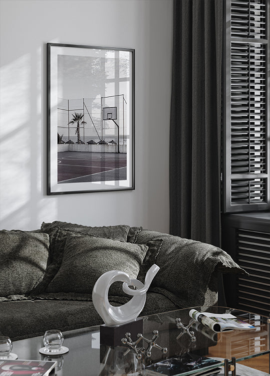 A minimalistic and evocative photograph of an outdoor basketball court close to the sea. The muted tones, the worn fence and the palm tree in the background evoke a feeling of nostalgia and calm. Perfect for those who love sports, urban aesthetics and coastal landscapes.