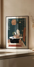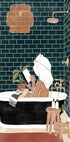 A cozy illustration of a woman relaxing in a bathtub and reading a book with a towel around her head. Surrounded by modern bathroom fittings, warm earth tones and a touch of greenery, the work radiates calm and self-indulgence. Perfect for creating a relaxing atmosphere in the home.